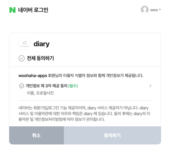 로그인을 하면 아래와 같이 동의 화면이 표시된다.