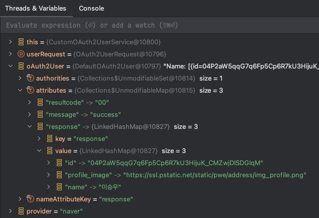 oAuthUser 는 정보 제공자인 naver 가 제공해준 정보인데, 아래에서 볼 수 있는 것처럼 response KEY 를 통해서 id, profile_image, name 등의 값을 구할 수 있는 구조이다.