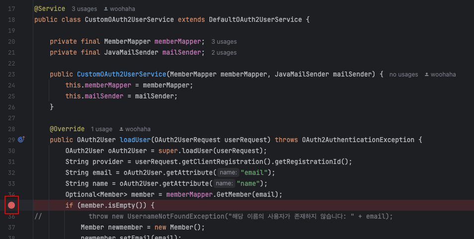 여기까지 완료하였으면 CustomOAuth2UserService 의 loadUser 함수에 BreakPoint 를 걸어놓고 디버그로 실행시켜보자.